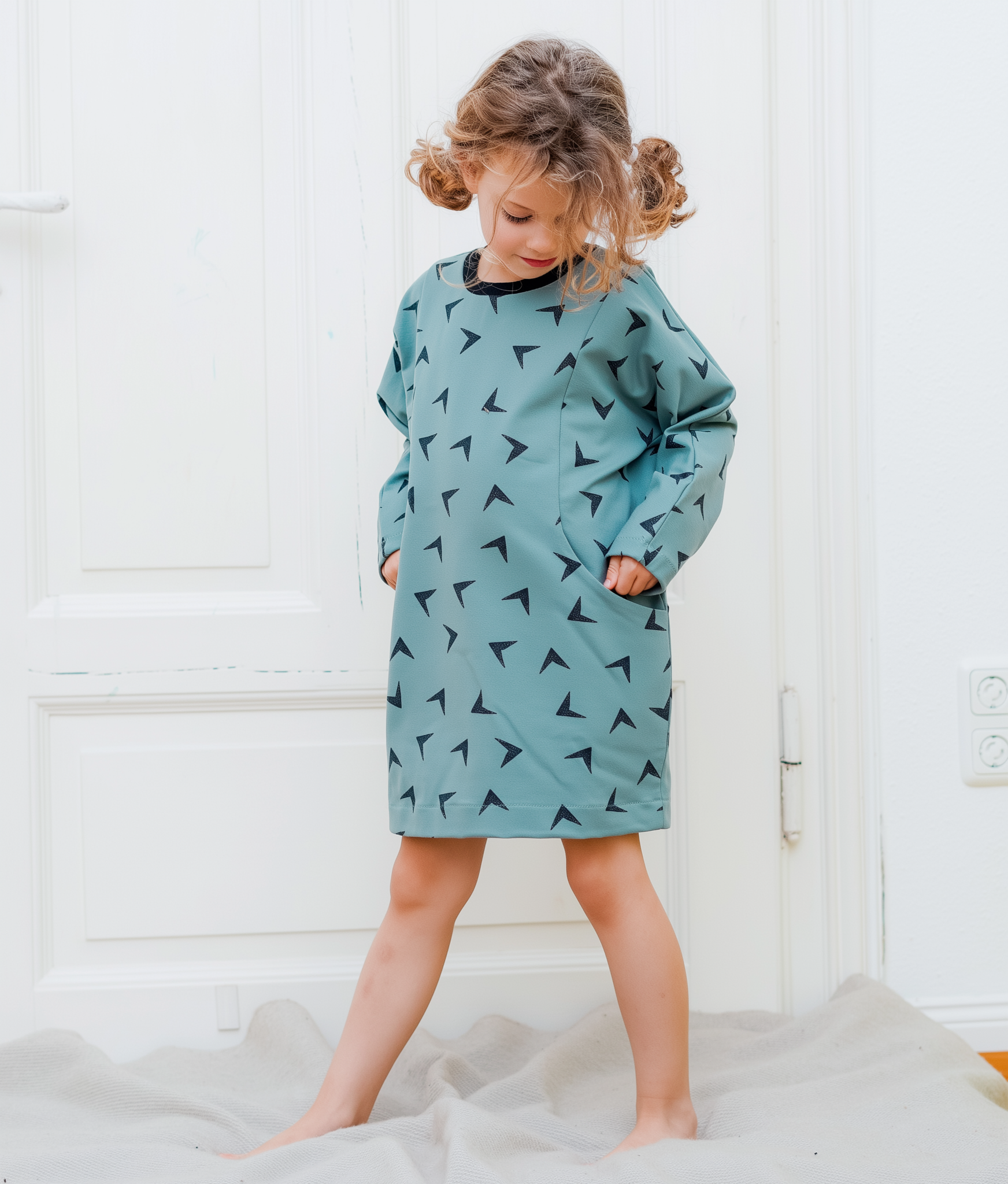 The Rainy Day dress is a sewing pattern for a child’s dress in the size range: 3 months (62) to 10 years (140). This dress has an oversized fit, slouchy sleeves, and side panels, with pockets. The dress fits right under the knees and allows some room for growth. We have included a short sleeve, so you can use the pattern all year round.