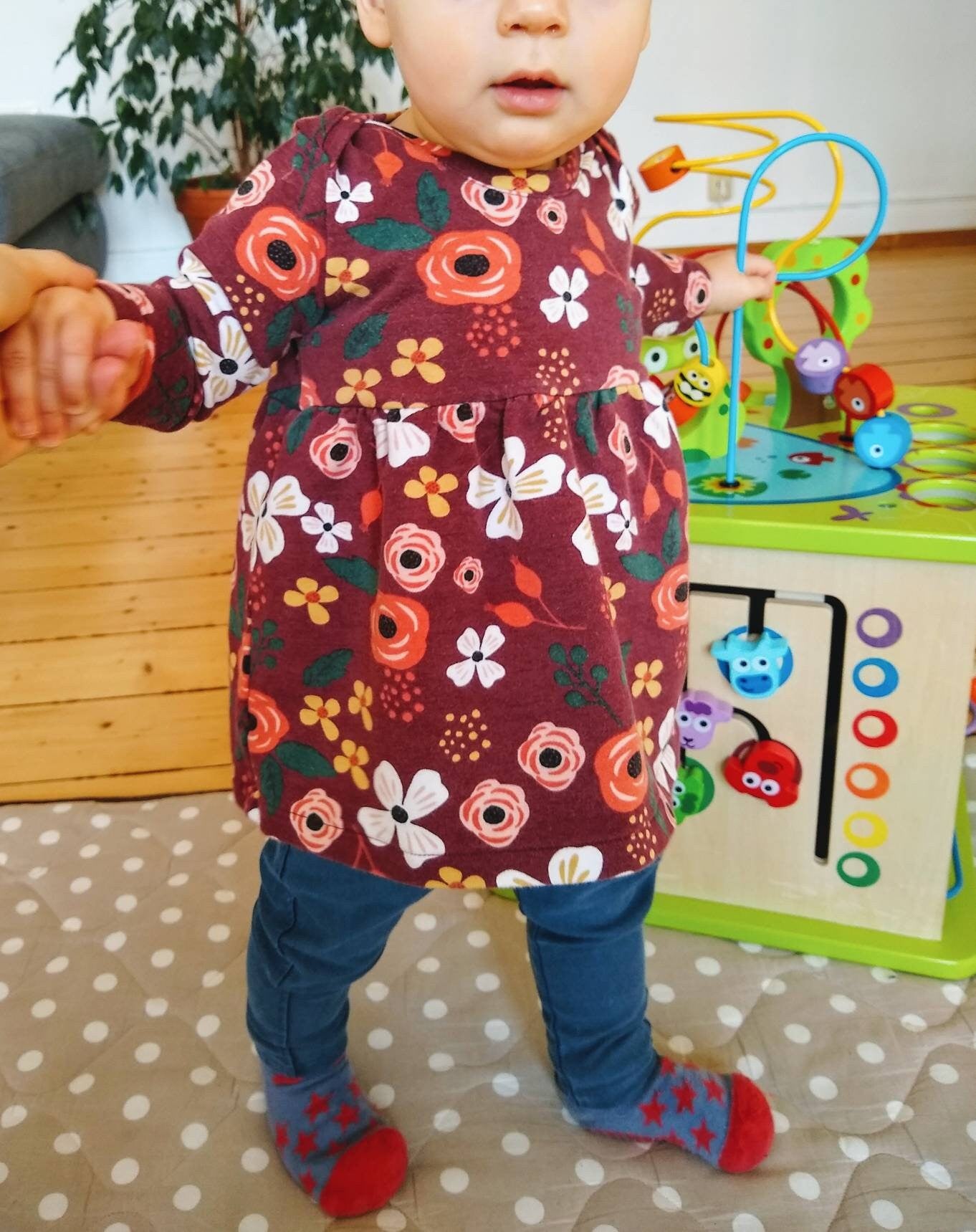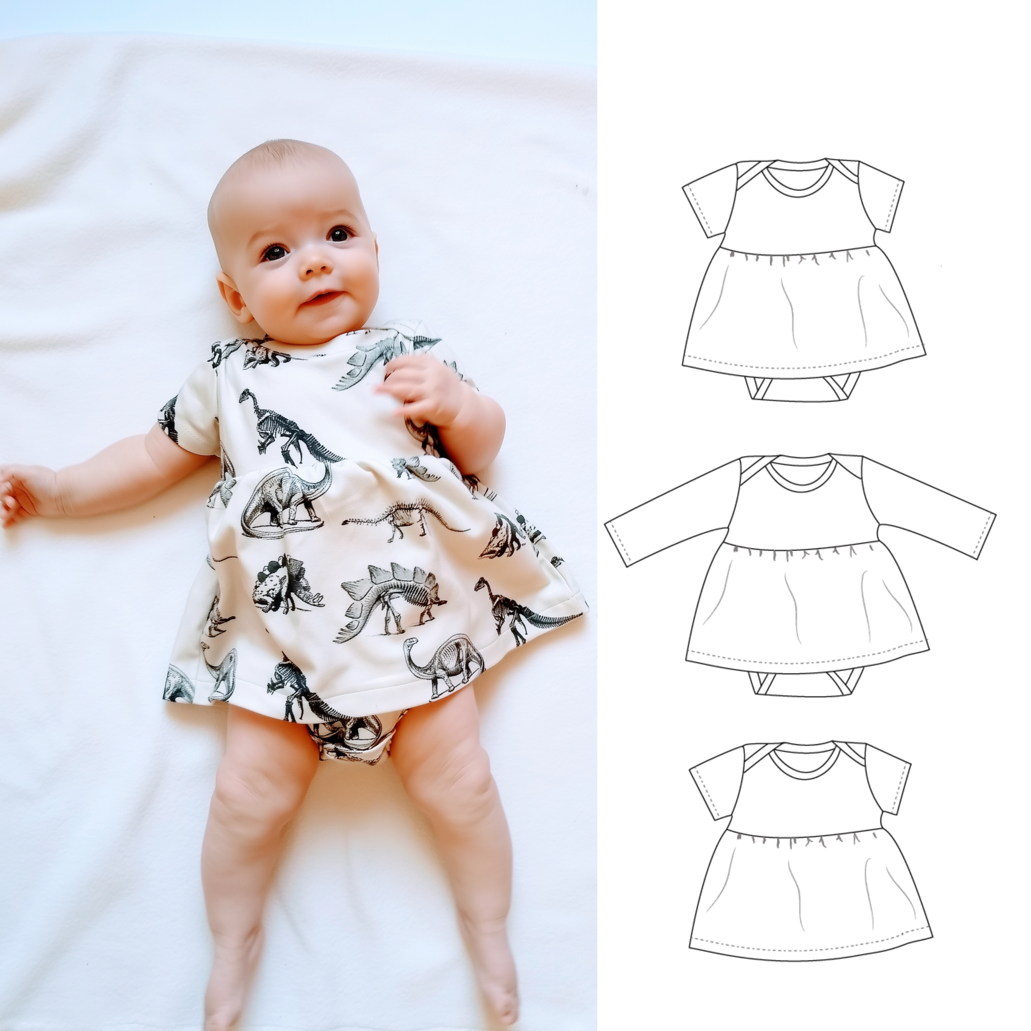 This is a sewing pattern and tutorial of a child’s bodysuit dress in size range: newborn (56) to 98 (3 years).
