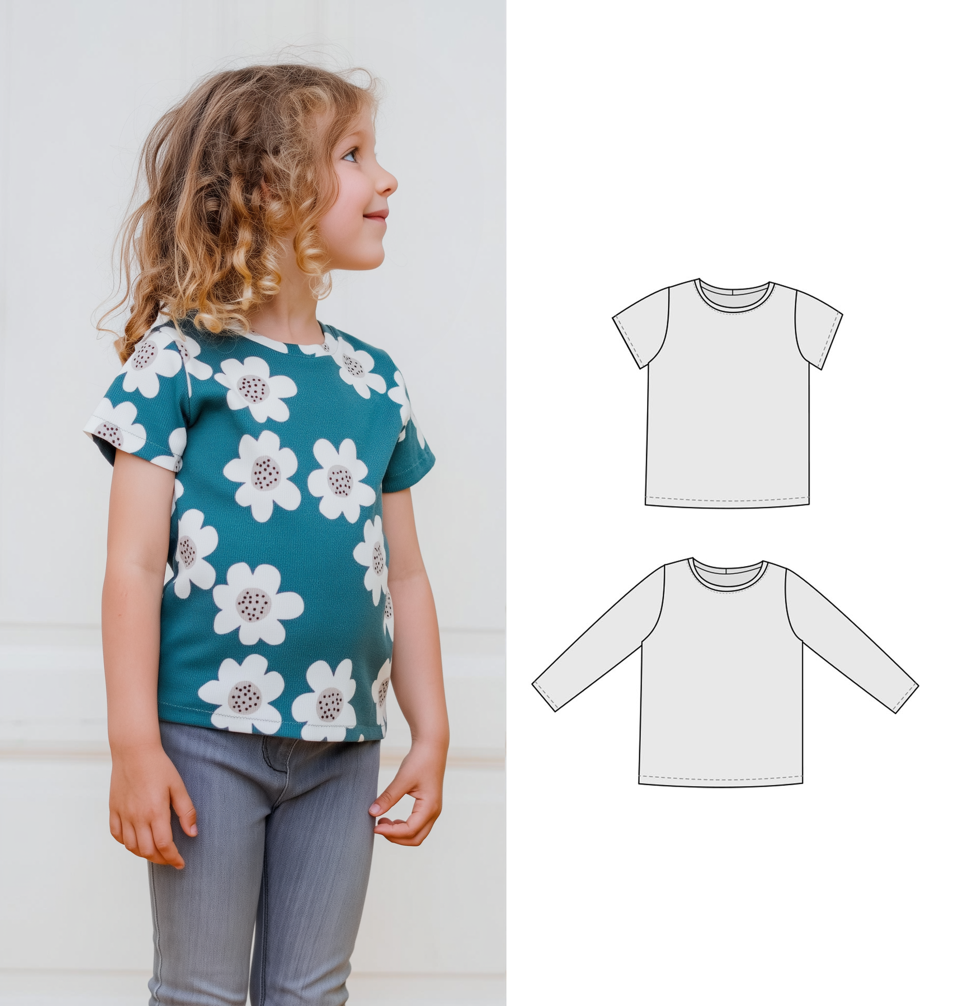 This is a sewing pattern and tutorial for a child’s basic t-shirt in size range: 0-3 months (62) to 12 years (152). This staple tee pattern includes a short and a long sleeve option. The tight fit makes it perfect for layering all year round. You can make pajamas, undershirts, or just basic classic tops to match any outfit. Fabric suggestion: knit fabric with a lot of stretches would be the perfect choice for this pattern - rib jersey, single jersey, or knit fabric with high elastane content.