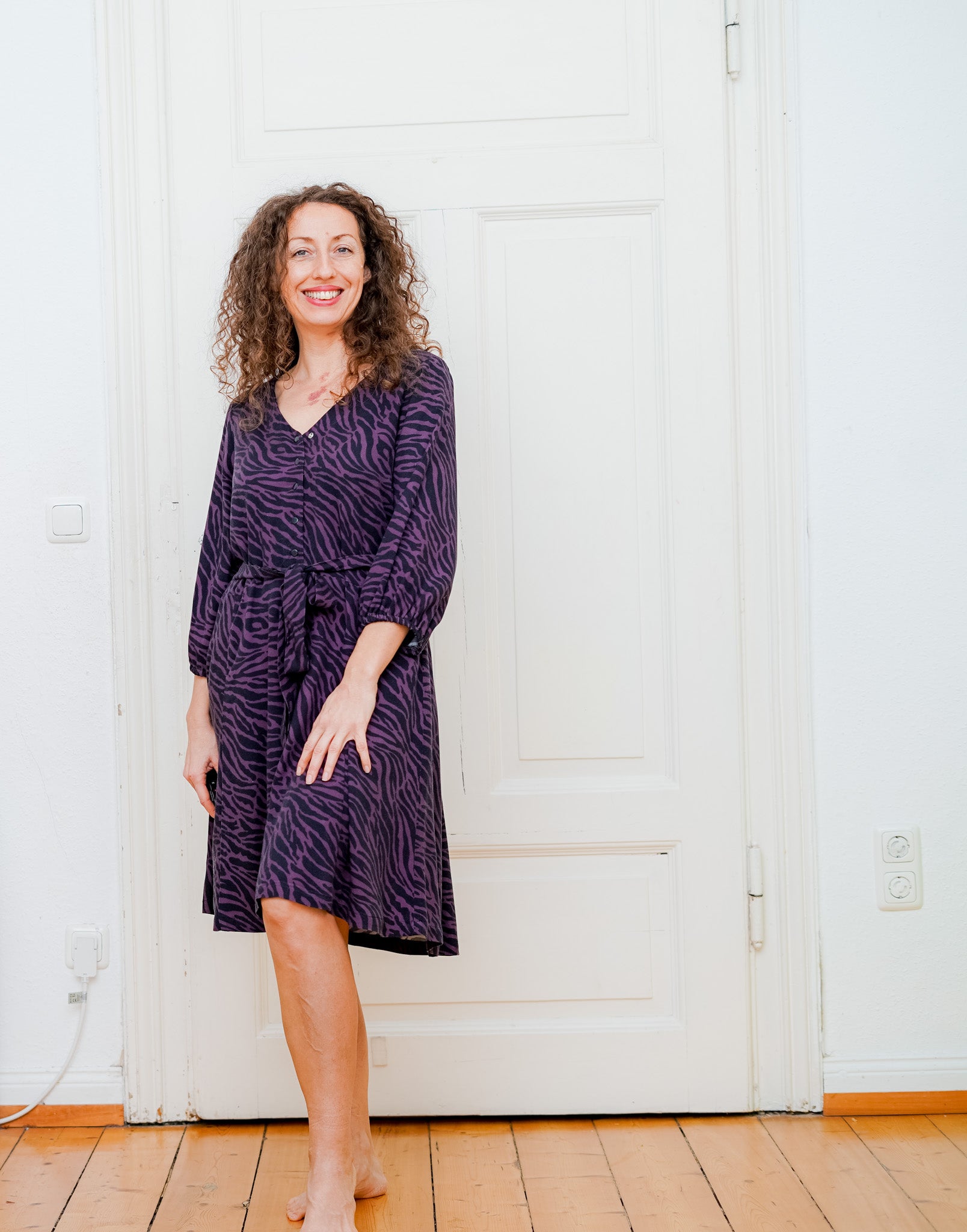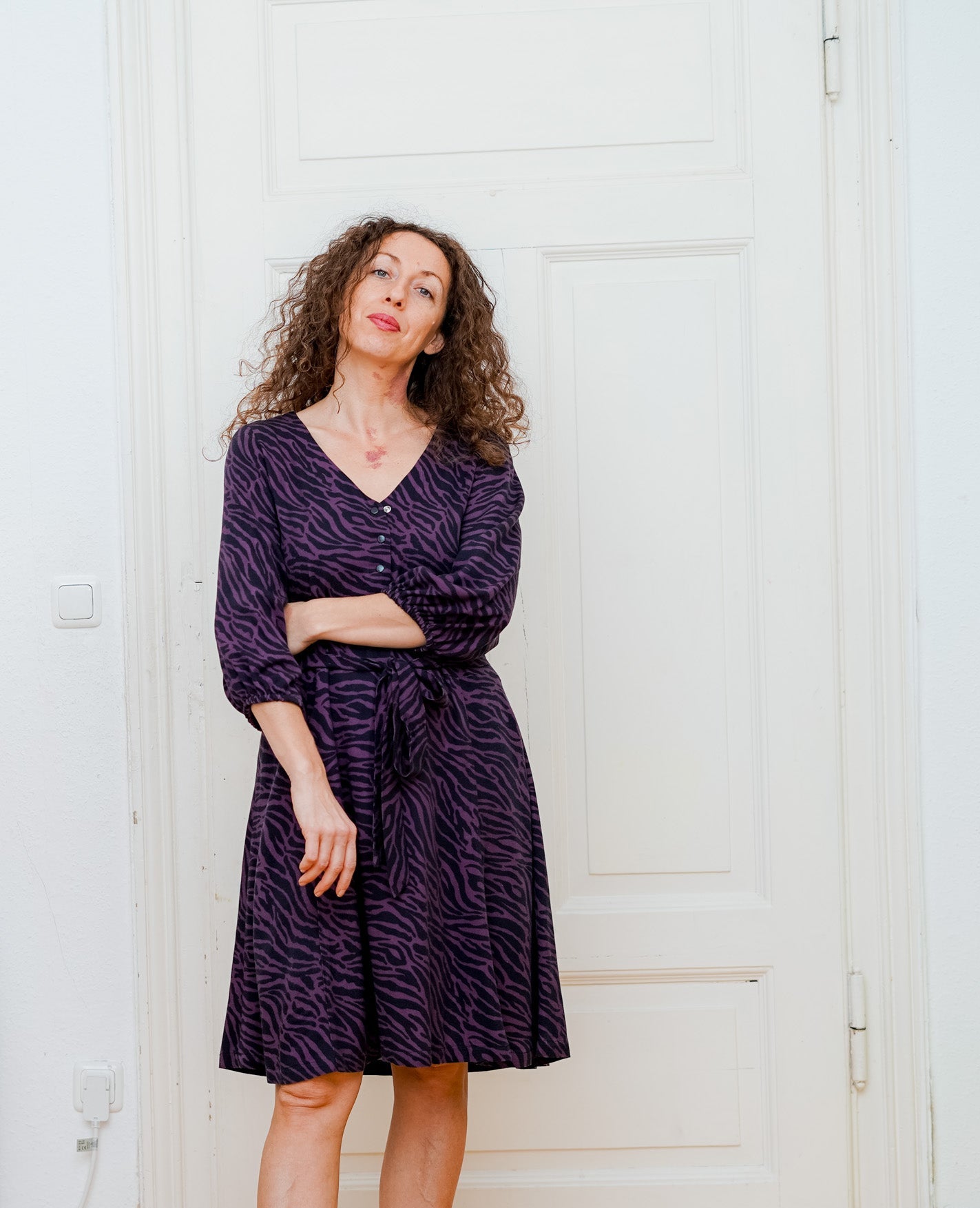 Nevena is a beautiful shirt and dress with a voluminous half sleeve and a feminine button V-neckline. The skirt consists of two panels, which expand with the length to create a lovely twirl to the dress.
